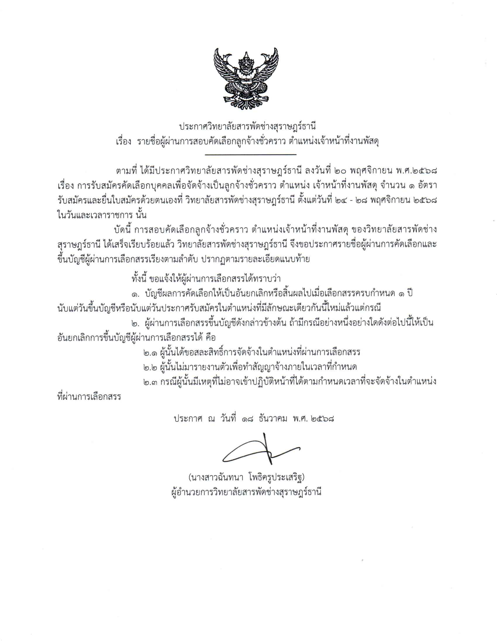 ประกาศ เรื่อง รายชื่อผู้ผ่านการสอบคัดเลือกลูกจ้างชั่วคราว ตำแหน่งเจ้าหน้าที่งานพัสดุ
