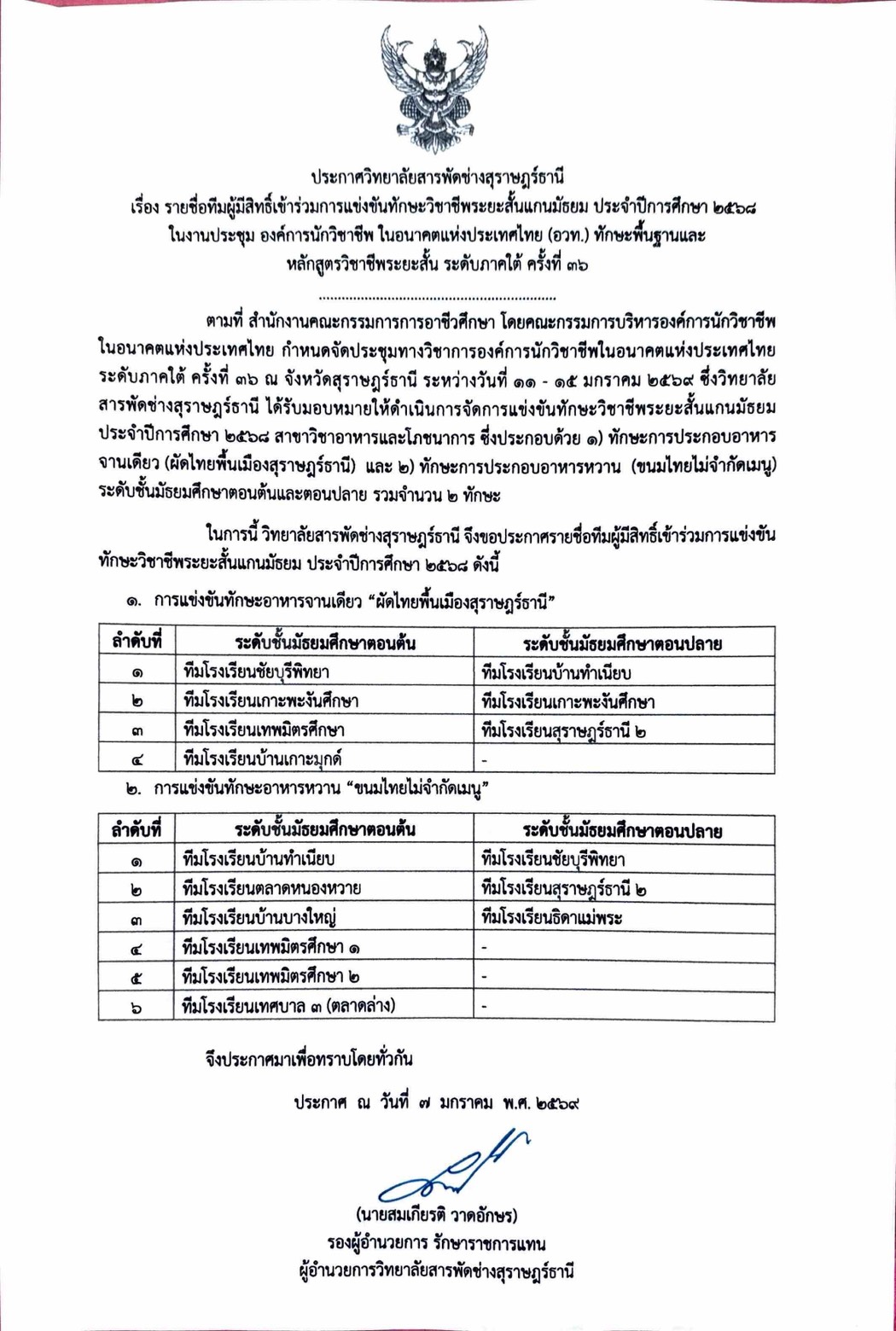 ประกาศ เรื่อง รายชื่อทีมผู้มีสิทธิ์เข้าร่วมการแข่งขันทักษะวิชาชีพระยะสั้นแกนมัธยม