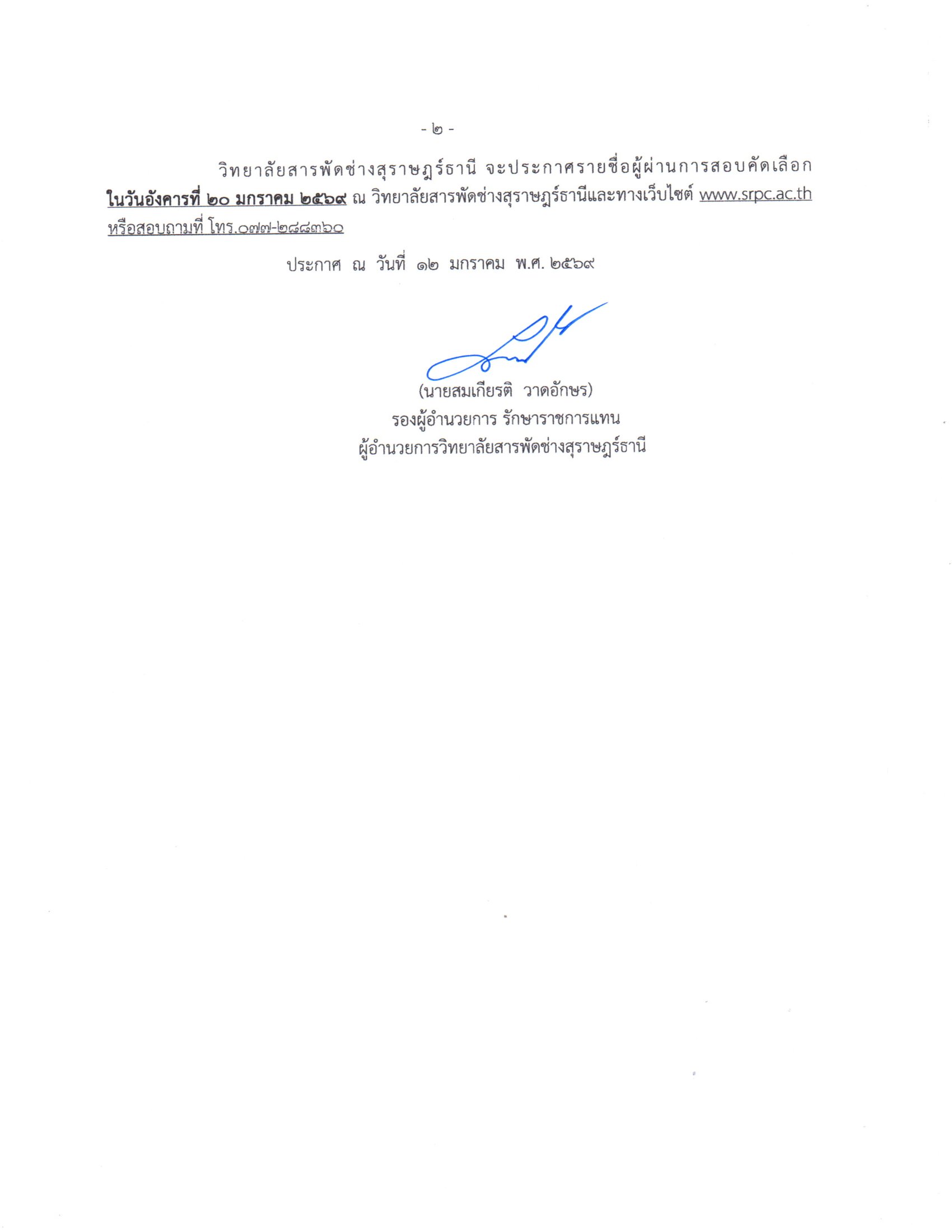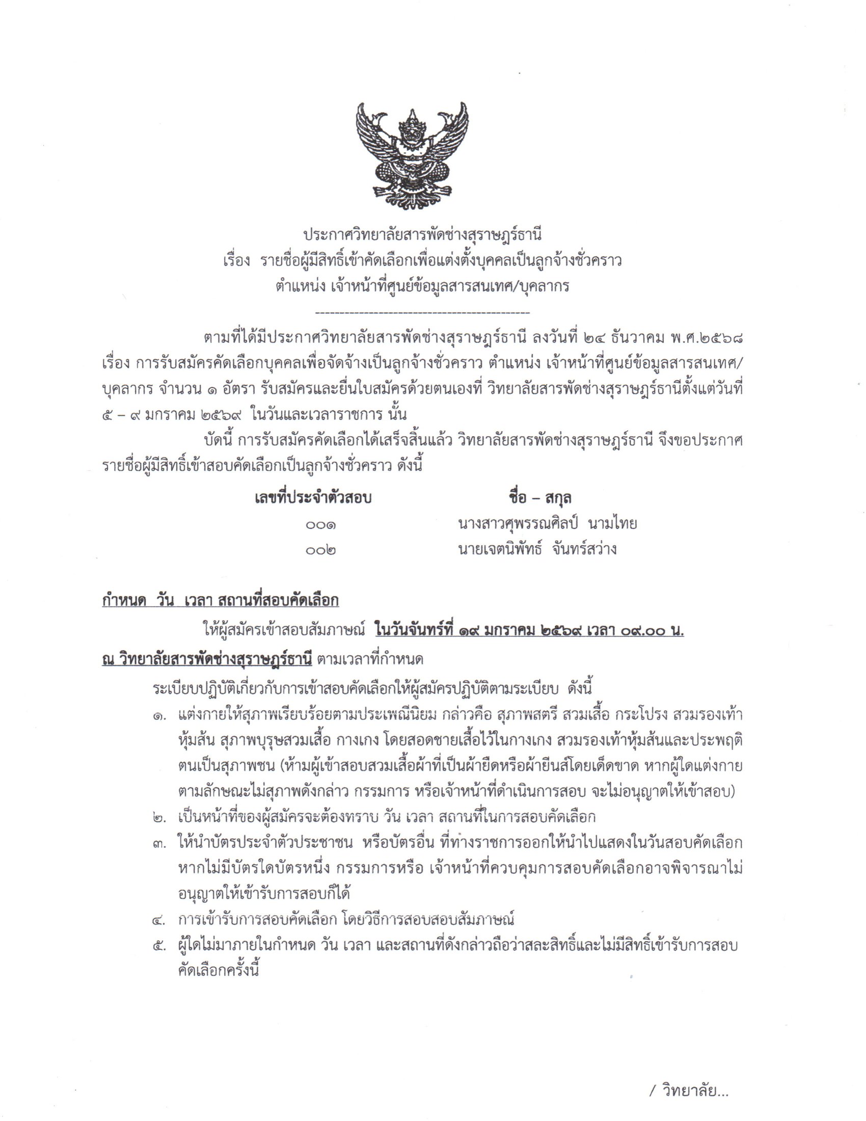 ประกาศ เรื่อง รายชื่อผู้มีสิทธิ์เข้าคัดเลือกเพื่อแต่งตั้งบุคคลเป็นลูกจ้าง ตำแหน่ง เจ้าหน้าที่ฯ