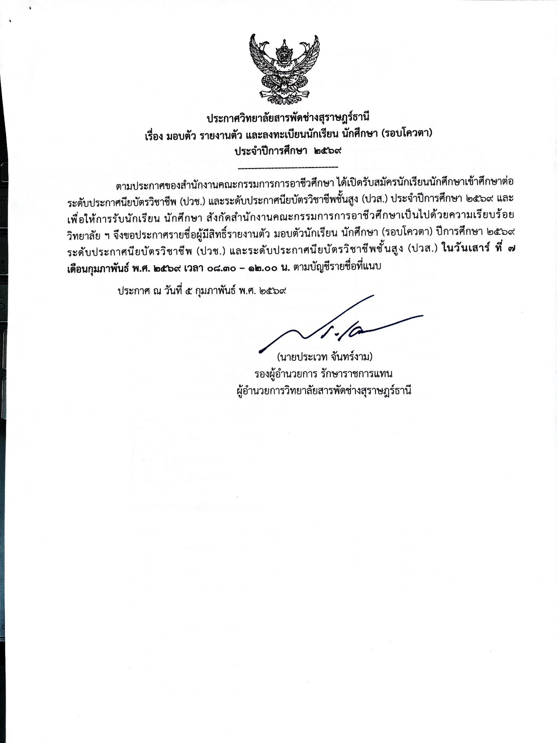 ประกาศ เรื่อง มอบตัว รายงานตัว และลงทะเบียนนักเรียน นักศึกษา (รอบโควตา)