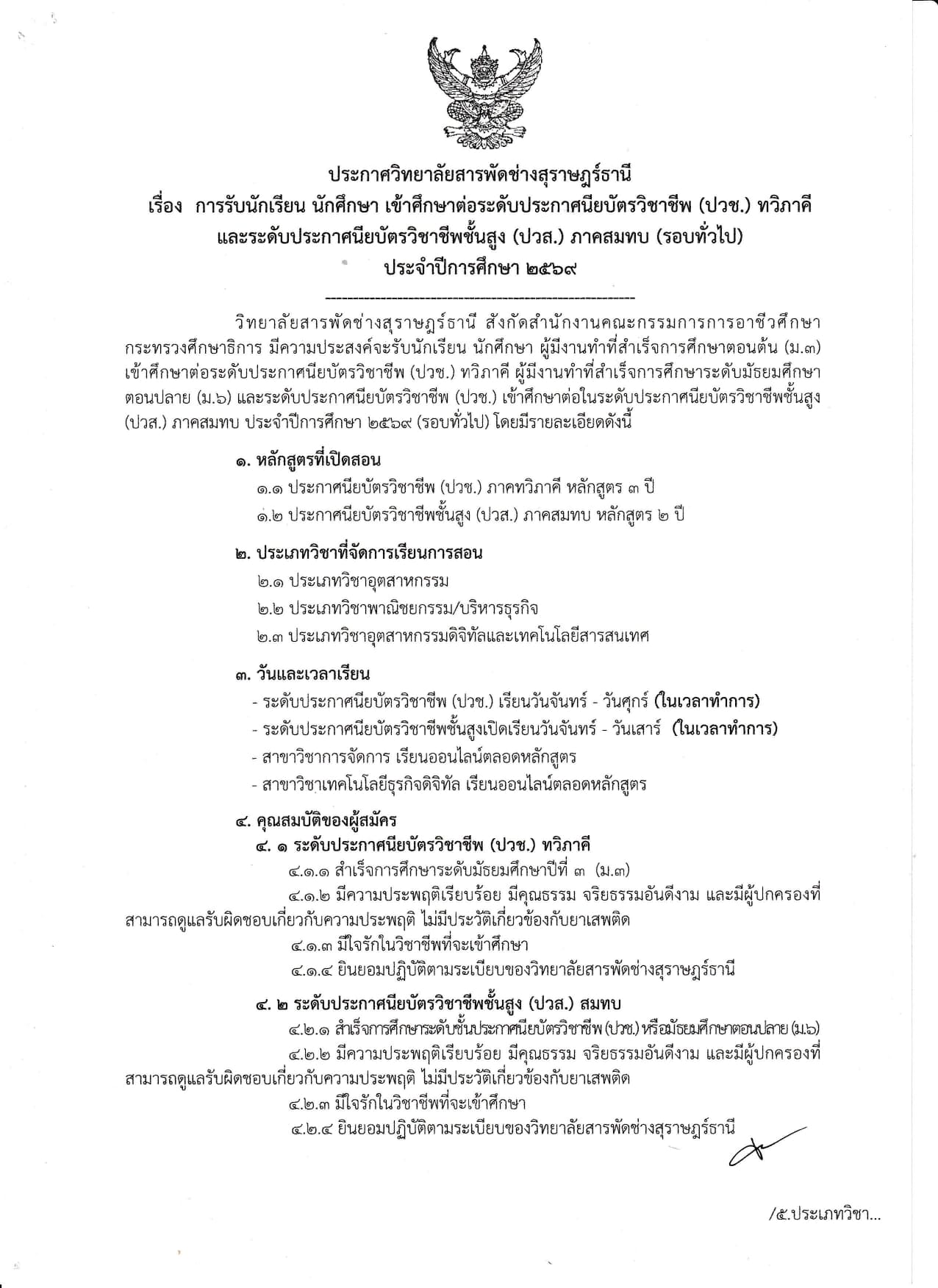 ประกาศ เรื่อง รับนักเรียน นักศึกษาเข้าศึกษาต่อระดับประกาศนียบัตรวิชาชีพ (ปวช.)ทวิภาคี และระดับประกาศ
